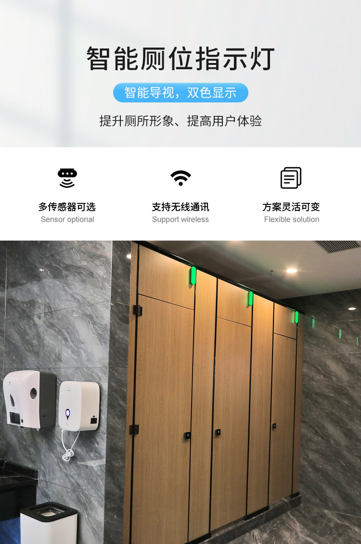 說(shuō)明:通過(guò)紅綠燈指示蹲坑與坐便有人無(wú)人信息,采用有線供電方式,控制采用無(wú)線LORA信號(hào)傳輸,LED造型燈