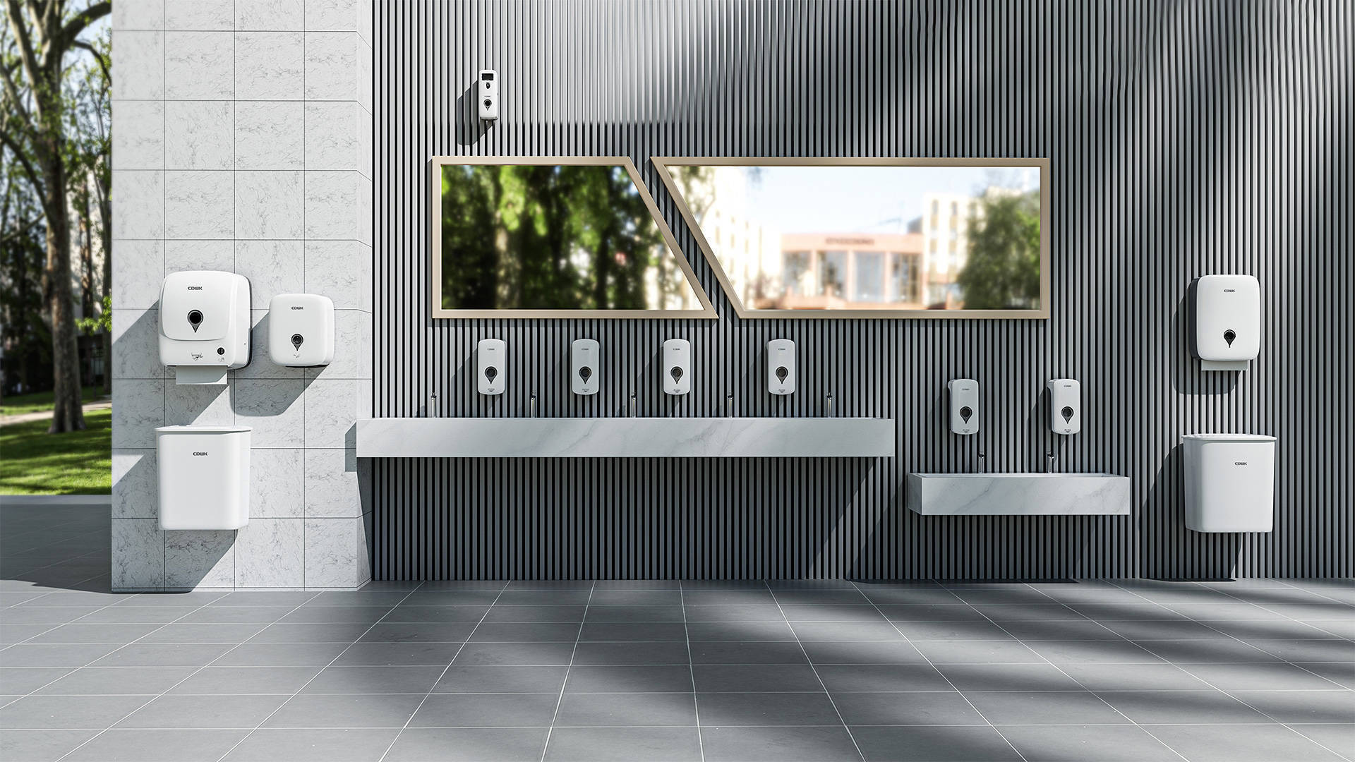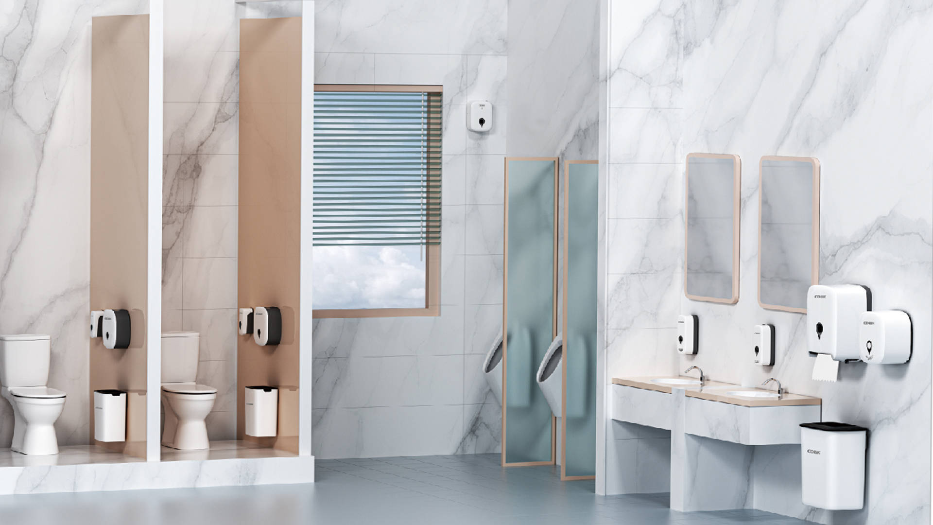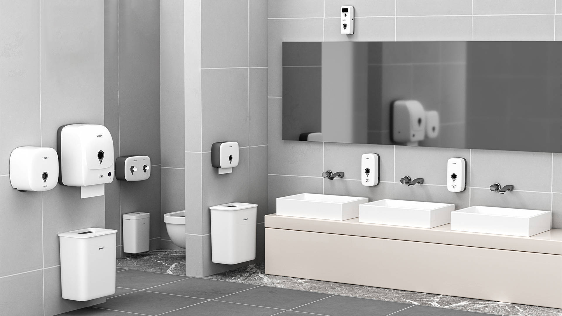 公共衛(wèi)生間包括高速干手機、水劑噴香機、擦手紙巾盒、感應皂液器、智能魔鏡、感應水龍頭、公共垃圾桶等系列化產(chǎn)品,產(chǎn)品套裝具有現(xiàn)代感的無縫功能性設計,尤其適用于高端洗手間環(huán)境,既展現(xiàn)高端形象又便于清潔,是公共場所洗手間設備的品質(zhì)之選。