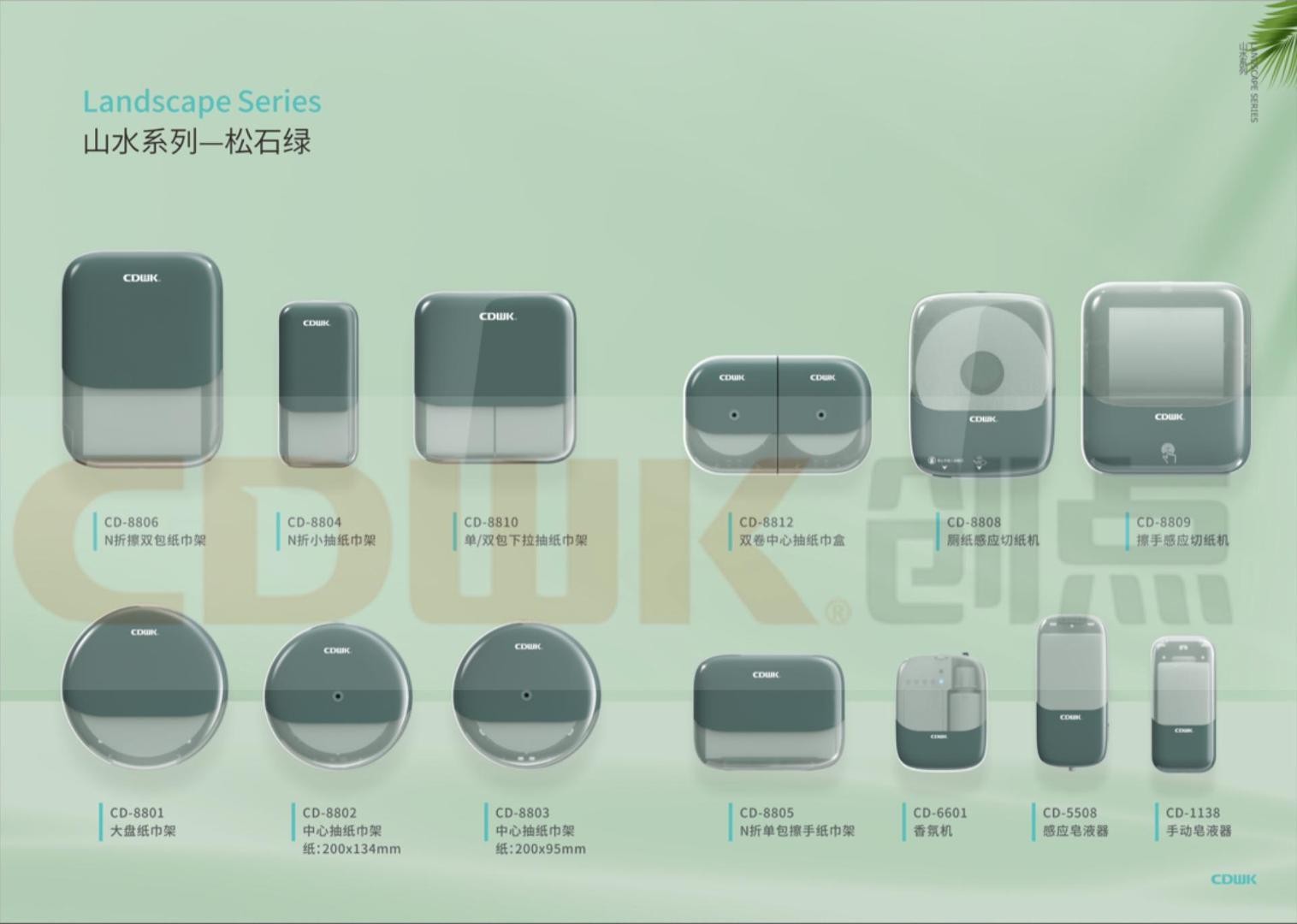 山水系列主打環保理念,崇尚清雅、純凈和自然的設計美學,以材質與肌理抒敘美感,達到“以意構境、以意造型、以意生色”天人合一的狀態。目前,該系列有鉆石白和松石綠兩種顏色,包括了大盤紙巾盒、雙卷紙巾盒、擦手紙巾盒、皂液器、感應切紙機、智能香氛機等產品。設計上以人為本,選擇極簡、留白的設計語言,使用更少的元素,采用雙色拼接,以新潮極簡的設計美學傳遞美好生活方式,同時使得產品呈現出細膩光滑的質感,擁有流暢的線條,極盡演繹簡約輕盈的美學造詣,塑造沉穩亦靈動的空間氣質。