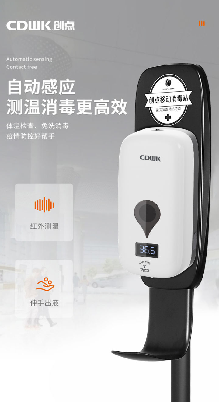 其移動(dòng)消毒站專為解決公共場(chǎng)所健康監(jiān)測(cè)、清潔消毒難題而來(lái)。整體外形基于簡(jiǎn)約美學(xué)而開(kāi)發(fā),黑白干凈的配色,讓整體機(jī)身給使用者帶來(lái)更加清爽整潔的視覺(jué)感受,更加融合了它極簡(jiǎn)的設(shè)計(jì)理念。產(chǎn)品設(shè)置了紅外線傳感器,用戶把手放置感應(yīng)區(qū)域,皂液器就可自動(dòng)出泡,降低了可能傳播細(xì)菌和病毒的風(fēng)險(xiǎn),衛(wèi)生又干凈,打造看得見(jiàn)的安全感,同時(shí)能有效控制浪費(fèi)現(xiàn)象,實(shí)現(xiàn)便捷測(cè)溫,滿足酒店業(yè)高效、便捷、節(jié)能的衛(wèi)生清潔需求。