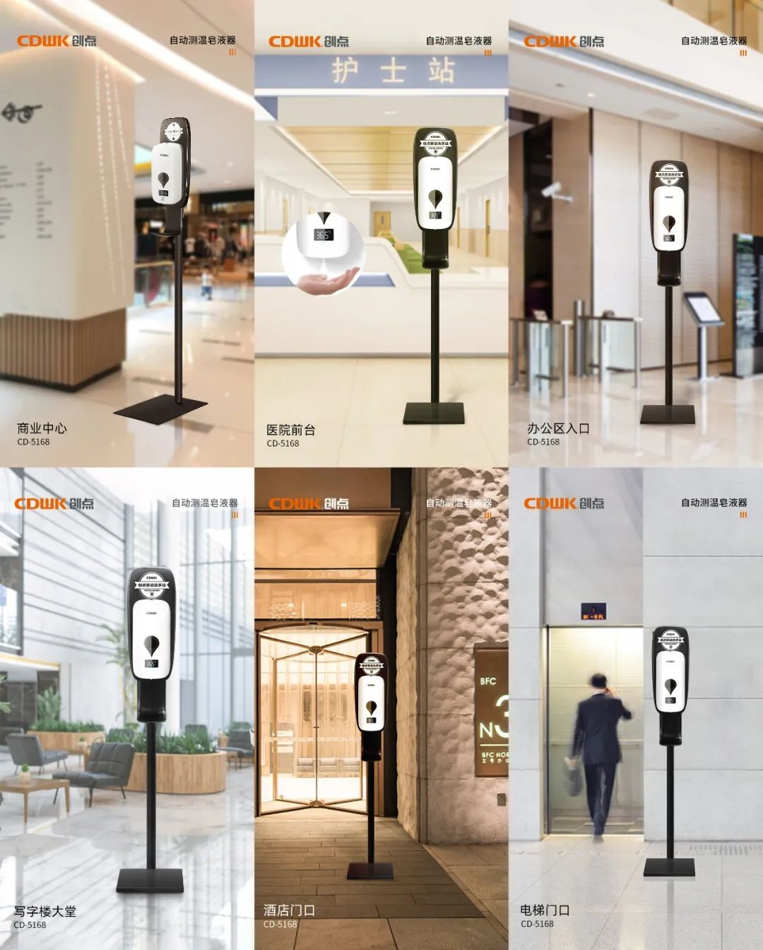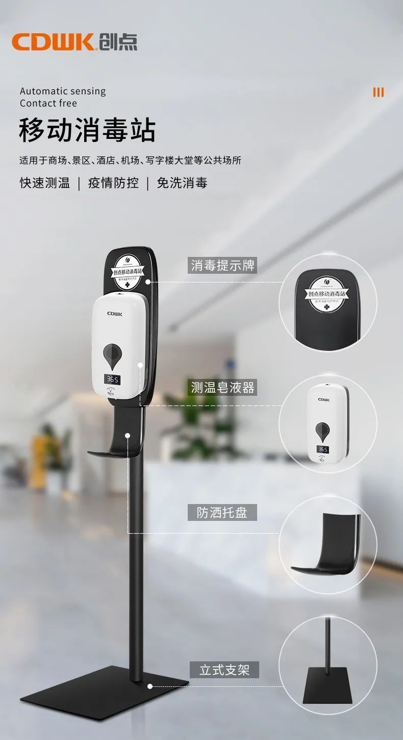 創點自動測溫皂液器,站好公共場合第一道疫情防線,感應測溫與手部消毒,12種語言自動播報溫度與異常狀態報警,配合底座與移動支架,滿足不同公共場合需求。